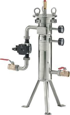 - les impuretés solides, boues et matières en suspension grâce à une poche filtrante en feutre qui capte les particules supérieures à 20µm suivant le modèle (autres finesses de filtration sur commande).
